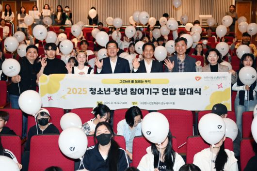 20일 수원특례시에 따르면 '그칠(Chill) 줄 모르는 우리'를 슬로건으로 내건 이날 발대식에는 청소년·청년 동아리, 청소년 참여·운영위원회, 청년네트워크, 봉사단 유니버스 등 수원시청소년청년재단 소속 40개 참여 기구에서 청소년·청년 400여 명이 참여했다.