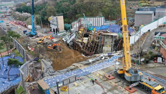 14일 경기도 광명시 신안산선 복선전철 공사현장이 붕괴로 인해 내려앉아 있다. 광명=뉴시스 |