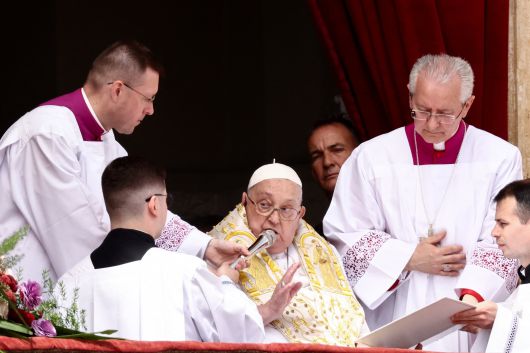 프란치스코 교황이 20일 정오에 성베드로 대성당의 로지아(loggia·발코니)에서 열린 부활절 축복 메시지 ‘우르비 에트 오르비(Urbi et Orbi·로마와 온 세계에)' 발표장에 모습을 드러냈다. 그는 메시지의 첫 문장을 직접 읽기도 했다. 앞서 이탈리아 매체들은 교황의 건강이 빠르게 회복되면서 부활절 행사에 직접 나설 것으로 예측해왔다. 교황은 이날 미사 등 행사를 직접 집전하지는 못했다.