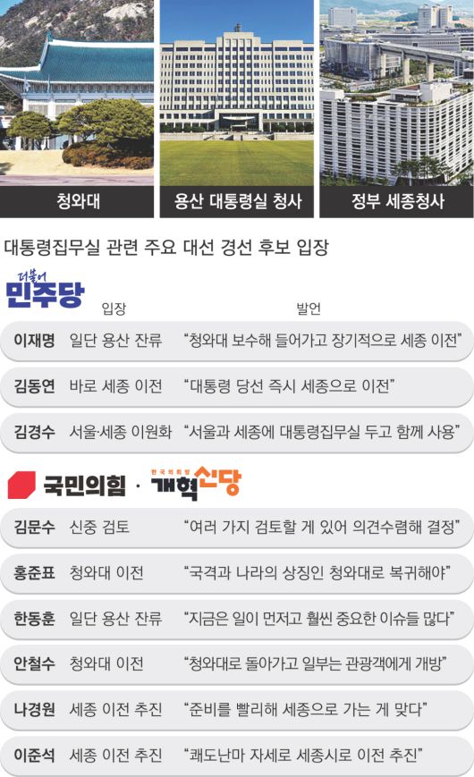 민주당과 달리 국민의힘 경선 후보들은 용산 이전 필요성부터 입장이 갈린다. 홍준표 후보와 안철수 후보는 용산을 나와 청와대로 돌아가야 한다고 주장한다. 한동훈 후보는 “지금은 일이 먼저”라며 용산 잔류를 공언했다. 김문수 후보는 “의견을 수렴해 결정해야 한다”고 유보적 입장을 내비쳤다.