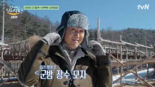 차에서 내린 이정재는 황태덕장 사전점검에 나섰다. 그는 신중하게 챙거온 군밤 장수 모자를 쓰고 변장을 했다.