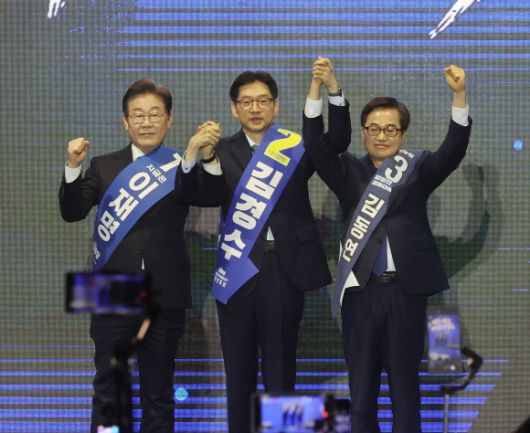 영남권 합동연설회서 인사하는 민주당 대선 경선 후보들 - 더불어민주당 대선 경선 후보들이 20일 울산시 울주군 울산전시컨벤션센터에서 열린 ‘제21대 대통령선거 후보자 선출을 위한 영남권 합동연설회’에서 당원들에게 인사하고 있다. 2025.4.20 울산 연합뉴스