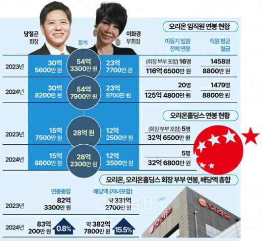 오리온이 호실적을 거듭하면서 담철곤·이화경 회장 부부의 연봉도 매해 최고치를 경신한다. 구체적으로 담철곤 회장은 지난해 사업회사인 오리온에서 30억8200만 원을, 이화경 부회장은 23억9700만 원을 받았다. 지주사인 오리온홀딩스에서는 담 회장이 15억8800만 원을, 이 부회장이 12억3500만 원을 가져갔다. 회장 부부의 지난해 합산 연봉은 83억200만 원이다. 전년 합산 연봉인 82억3300만 원보다 0.8% 많은 금액이다.