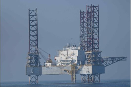 서해 중국 고정 구조물. 중동에서 약 30년간 사용되던 프랑스제 시추선으로, 2016년 폐처리됐을 때 중국이 매입해 개조해 2022년 10월 서해 잠정조치수역에 설치했다. 해수부 해양조사선 온누리호가 지난 2월 26일 현장 조사에 나가 실제 촬영한 것이다. /국토위 국민의힘 엄태영 의원 |