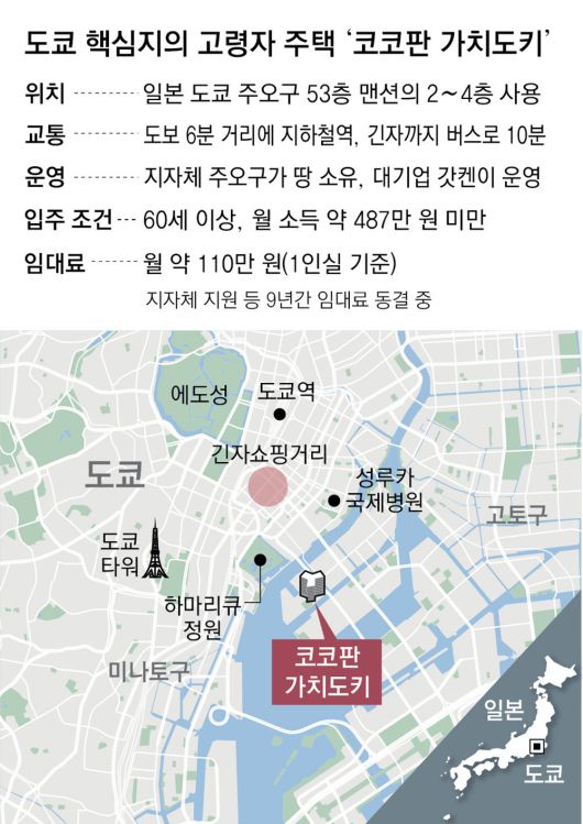 어떻게 도쿄 핵심지에 저렴한 노인 주택이 들어서는 게 가능했을까. 주오구 측이 건설지 땅 지분을 일부 갖고 있었기 때문이다. 주오구는 다른 지분 소유자들과 함께 고층 아파트를 지었고, 건물이 완성되자 땅 소유분만큼의 공간을 시니어 주택으로 만들기로 했다. 공모를 통해 운영 사업자로 일본 최대 교육·의료 복지 기업인 ‘갓켄(學研)’의 고령자 주택 브랜드인 ‘코코판’이 선택됐다.