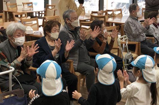 일본 도쿄의 중심지에 있는 고령자 주택 ‘코코판 가치도키’에서 입주자들이 인근 어린이집 원생들과 함께 교류의 시간을 갖고 있다. 사진 제공 갓켄 |