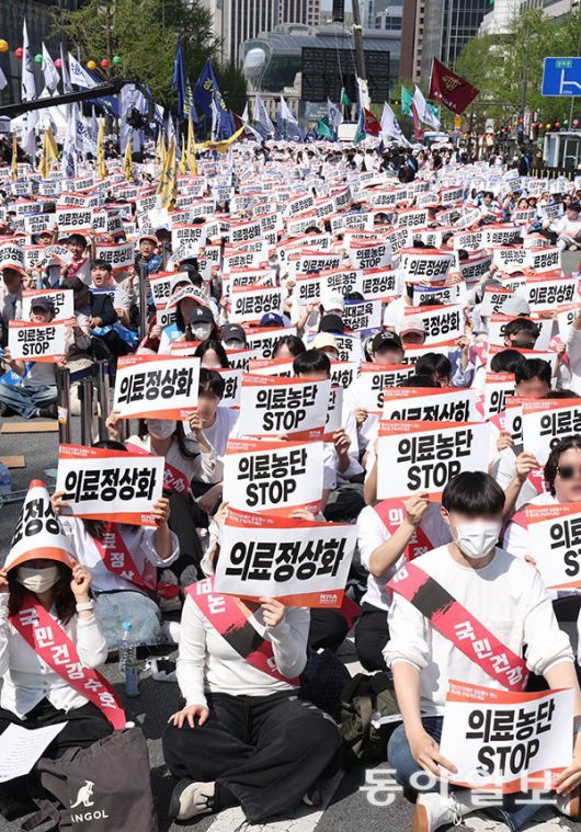 20일 대한의사협회가 서울 중구 숭례문 앞 도로에서 연 ‘의료 정상화를 위한 전국 의사 궐기대회’에 참가한 전공의, 의대생과 개원의 등이 “의료 농단 중단하라” 등의 구호를 외치고 있다. 2025.04.20 신원건 기자 laputa@donga.com |