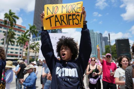 미국 전역에서 도널드 트럼프 대통령과 정책에 반대하는 대규모 집회가 열린 19일 플로리다주 마이애미에서 열린 시위에 참석한 한 시민이 '관세 부과를 중단하라'고 적힌 손팻말을 들고 있다. 마이애미=AP 연합뉴스