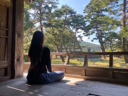 경북 예천군 청년마을 프로그램 '생텀마을'의 한 참가자가 조선시대 지어진 용문면 초간정의 그림 같은 풍경 앞에서 명상에 잠겨 있다. 생텀마을 제공