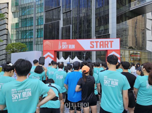 20일 서울 송파구 신천동 롯데월드타워 ‘2025 롯데월드타워 스카이런(Sky run)’ 현장. 타워 주변엔 온통 민트색 티셔츠와 운동복 차림의 이들로 북적였다. 555m 국내 최고 높이 빌딩인 롯데월드타워에 오르기 위해 몰려든 것. 저마다 출발 전 몸을 풀기 위해 체조를 하거나, 부상을 방지하기 위해 보호용 테이프를 붙이는 등 마라톤 준비에 한창이었다.