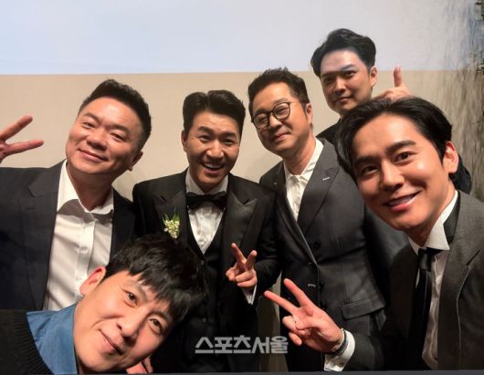 가수 김종민이 지난 20일 자신의 결혼식을 축하해주기 위해 온 연예인 하객들과 기념 촬영하고 있다. 사진 | 스포츠서울DB |