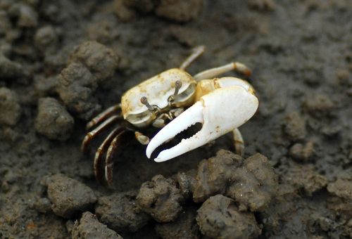 흰발농게는 우리나라 서해안과 남해안 갯벌에 드물게 서식하며 수컷의 경우 한쪽 집게다리가 유난히 크고 하얀 게 특징이다.