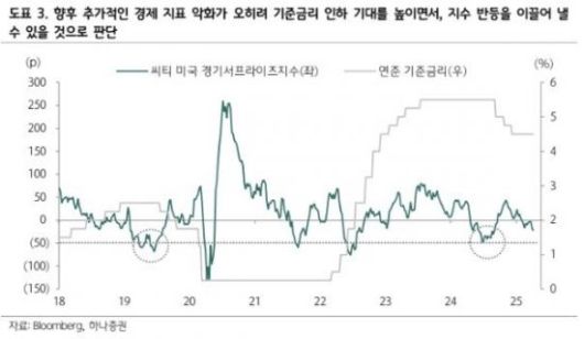 하나증권은 미국의 부진한 경제지표가 기준금리 인하 기대감을 끌어올리면서 지수 반등까지 이어질 수 있을 것으로 내다봤다.