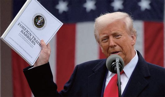 도널드 트럼프 미국 대통령이 4월 2일 워싱턴 D.C. 백악관 로즈가든에서 국가별 상호 관세를 발표하며 미국무역대표부(USTR)가 펴낸 ‘2025 국가별 무역장벽보고서’를 들어 보이고 있다. /로이터연합 |