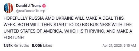 트럼프 대통령의 이번 게시글은 블라디미르 푸틴 러시아 대통령이 일방적으로 선언한 '부활절 휴전'이 끝나기 약 45분 전에 나왔다.