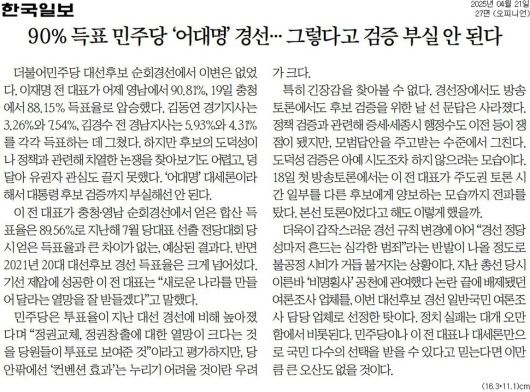 한국 = 90% 득표 민주당 '어대명' 경선… 그렇다고 검증 부실 안 된다