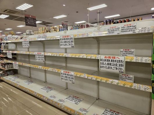 일본 내 쌀 품귀 현상이 일어난 지난해 8월 한 현지 마트 쌀 코너가 텅 비어 있다. 엑스 갈무리 |