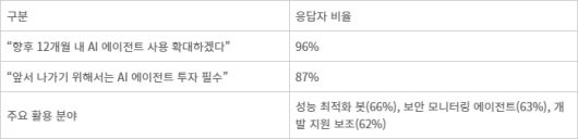 주요 활용 분야로는 성능 최적화 봇(66%), 보안 모니터링 에이전트(63%), 개발 지원 보조(62%)로 나타났다.