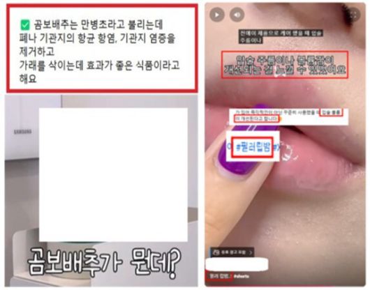 이는 식품의약안전처가 최근 허위·과대광고로 적발한 숏폼 콘텐츠 사례다. ‘곰보배추’ 관련 광고의 경우 ‘식품이 질병 예방·치료에 대한 효능·효과가 있는 것으로 인식할 우려가 있는 광고’로, ‘입술’ 관련 광고는 ‘일반화장품을 기능성화장품처럼 광고하거나 기능성 화장품 심사 내용과 다른 광고’라 관련 법 위반 판단을 받았다.