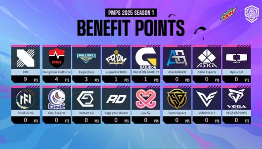 또 농심 레드포스(4점) 이글 아울스(3점) e스포츠 프롬(1점) 대전 게임PT(1점) 등이 2위와 3위에게 주어지는 파이널 베네핏 포인트를 경기일별로 각각 나눠 가졌다.