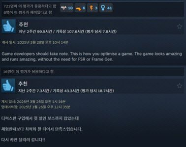 스팀 리뷰에서도 “출시 초기부터 최적화가 완성된 게임은 드물다”, “싱글 패키지임에도 기술적 완성도가 인상적이다”라는 반응이 이어지고 있다.