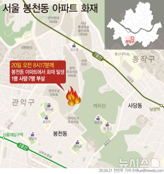 [서울=뉴시스] 21일 관악소방서에 따르면 이날 오전 8시17분께 21층 규모의 아파트에서 화재가 발생했다. 이 화재로 4층에 거주하던 남성 1명이 사망했다. 경찰은 신원 미상의 인물이 불상의 도구로 화염을 방사한 것으로 보고 있다. (그래픽=전진우 기자)