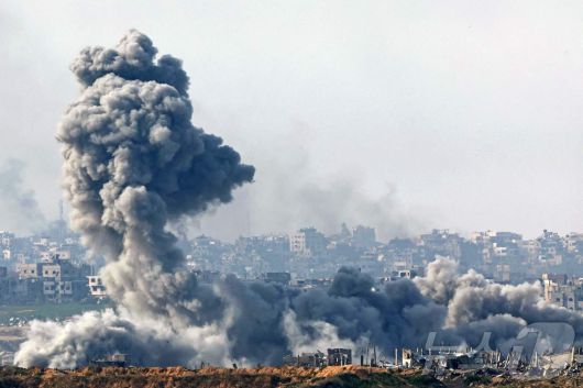 14일 (현지시간) 팔레스타인 가자 지구 북부의 파괴된 빌딩 위에서 이스라엘 군의 포격으로 연기 기둥이 솟아 오르고 있다. 2025.01.15 ⓒ AFP=뉴스1 ⓒ News1 우동명 기자 |