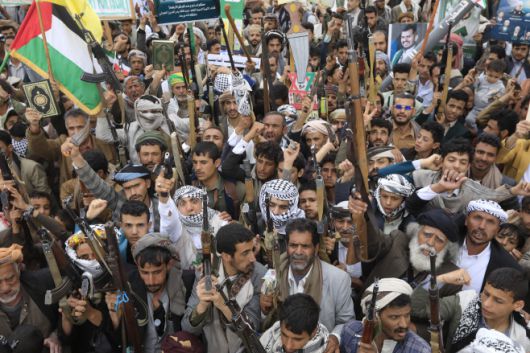후티 반군 지지자들이 지난 18일(현지시간) 예멘 사나에서 미군의 공습에 반대하는 시위 도중 구호를 외치며 무기를 들어 올리고 있다./EPA 연합뉴스 |