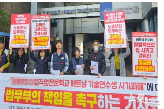 피해자 중 1명인 베트남 국적 B(20대)씨는 이날 법무부 부산출입국·외국인청 김해출장소 앞에서 열린 기자회견에서 "저는 2023년 한국으로 직업 유학을 위해 총 비용 4억3500만동(2300만원)을 가족 등으로 받아서 유학원과 A학교에 지불했다"며 "그런데 A학교는 불성실한 태도 등으로 인해 비자 발급을 받지 못했고 비자가 없는 우리는 거리에 나가는 것이 매우 두렵다"고 호소했다.