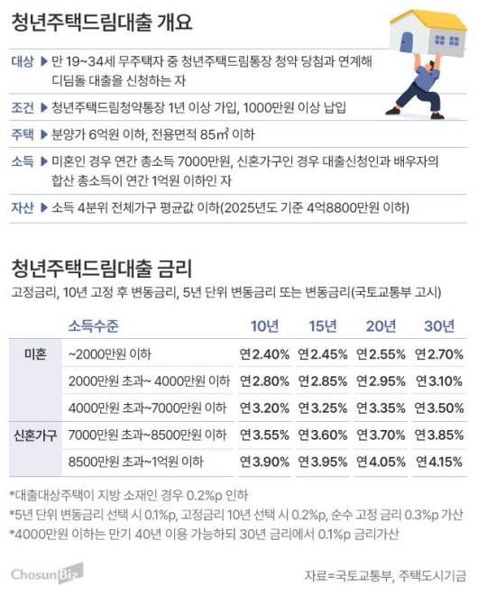 택드림청약’에 가입한 무주택 청년(청약 당첨 시 만39세 이하)이 청약에 당첨될 경우 저금리로 주택자금을 빌릴 수 있는 정책금융 상품이다. 이용 요건은 미혼청년주택드림대출은 ‘청년주가구는 연 소득 7000만원 이하, 신혼부부는 부부합산 연소득 1억원 이하, 순자산액(2025년 기준) 4억8800만원 이하여야 한다.
