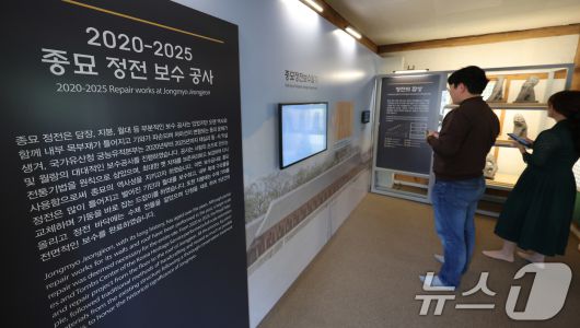 (서울=뉴스1) 박지혜 기자 = 21일 서울 종로구 종묘에서 열린 '삼가 모시는 공간, 종묘' 특별전을 찾은 관람객들이 전시를 둘러보고 있다. 이번 전시는 5년간 수리를 마친 종묘 정전에 조선의 역대 국왕과 왕비, 대한제국 황제와 황후의 신주(죽은 사람의 위패)를 다시 모시는 것을 기념해 진행됐으며, 6월 16일까지 진행된다. 2025.4.21/뉴스1