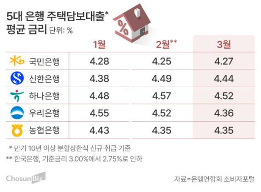 21일 은행연합회 소비자포털에 따르면 5대 은행(KB국민·신한·하나·우리·NH농협)의 신규 취급 주담대 평균 금리는 지난달 기준 4.27~4.52%로 분포돼 있다. 지난 1월 평균 금리대인 4.28~4.55%에서 크게 변하지 않았다. 한국은행이 지난해 두 차례, 올해에도 2월 한 차례 기준금리를 인하했지만 은행 주담대 금리엔 별다른 영향을 미치지 못하고 있다.