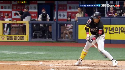 [스포츠서울 | 최승섭기자] KT 위즈 유준규가 경기 중 투수가 던진 ‘원바운드’(땅에 한 번 튄) 공을 타격하는 보기 드문 장면을 연출했다.