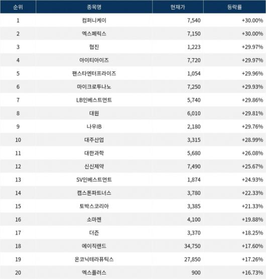 6위 마이크로투나노(424980)는 종가 7,250원으로 29.93% 상승 마감했다. 7위 LB인베스트먼트(309960)는 종가 5,740원으로 29.86% 상승 마감했다. 8위 대원(007680)은 종가 6,010원으로 29.81% 상승 마감했다. 9위 나우IB(293580)는 종가 2,180원으로 29.76% 상승 마감했다. 10위 대주산업(003310)은 종가 3,315원으로 28.99% 상승 마감했다.
