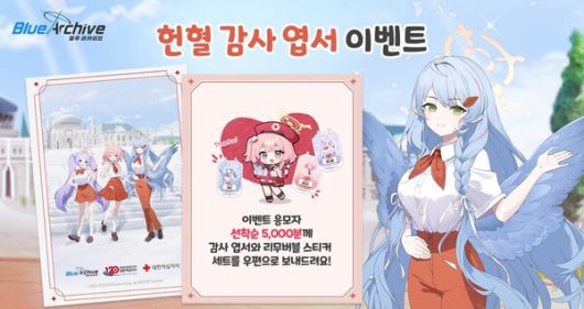 넥슨게임즈는 21일 '대한적십자사 X 블루 아카이브 'Saving Lives, Together' 캠페인을 시작했다. 헌혈을 완료하고 응모하면 선착순 5000명에게 하나메, 세리나, 미네 감사 엽서 및 리무버블 스티커 3종 세트로 이뤄진 특별 굿즈를 증정한다.