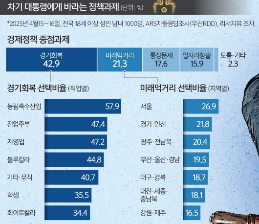 지역별로도 차이를 보였다. 바다와 접한 무역 도시는 통상 문제를 중점과제로 여겼다. 부산·울산·경남은 경기 회복(38.4%) 다음으로 통상 문제(22.9%)를 우선 과제로 택했다. 최근 트럼프 행정부가 관세를 올리며 통상에도 빨간불이 켜졌기 때문으로 보인다. 안일원 리서치뷰 대표는 “장기화하는 경제침체와 더불어 트럼프 행정부의 고관세 정책 등에 따른 위기감이 반영된 것”이라고 해석했다.