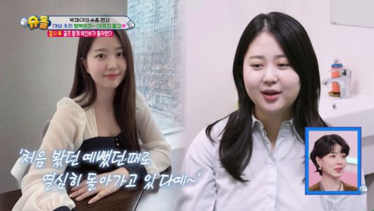 그러나 전문의는 "살 빠지면 다 좋아질거다. 점점 회복하고 있고 부종도 좋아지고, 부기가 많이 빠졌다. 처음 봤던 예뻤던 때로 열심히 돌아가고 있다"고 했다.