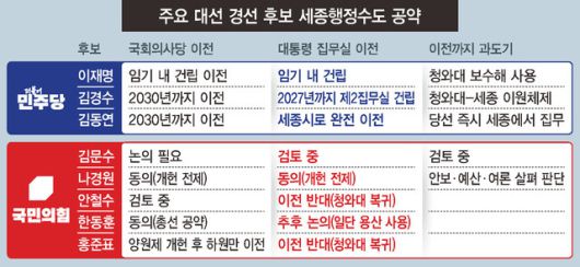 적극적인 쪽은 더불어민주당 대선 경선 후보들이다. 민주당 후보들 전원이 대통령 집무실과 국회의사당의 세종 완전 이전을 공약했다. 이재명 후보는 지난 17일 페이스북을 통해 “국회 세종의사당과 대통령 세종 집무실을 임기 안에 건립하겠다”고 약속했고, 김경수 후보도 21일 정책자료집에서 “새정부 국무회의는 세종청사에서 실시하고, 헌법에 수도조항 신설하겠다”고 했다. 김동연 후보도 17일 정책공약집에서 “대통령실과 국회를 세종으로 완전 이전하고, 대법원과 대검찰청은 충청권으로 이전”한다는 계획을 내놨다.