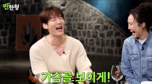 신동엽이 최진혁에게 조회수를 위해 가슴골 퍼포먼스를 요청하며 현장을 후끈 달궜다. 사진= 유튜브 채널 ‘짠한형’ |