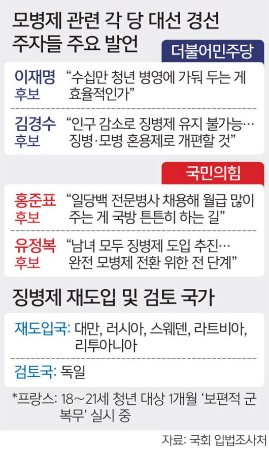 “징병제의 장점과 모병제의 장점을 섞어 ‘선택적 모병제’로 운영하는 게 맞겠다고 생각한다.”(더불어민주당 이재명 경선 후보)