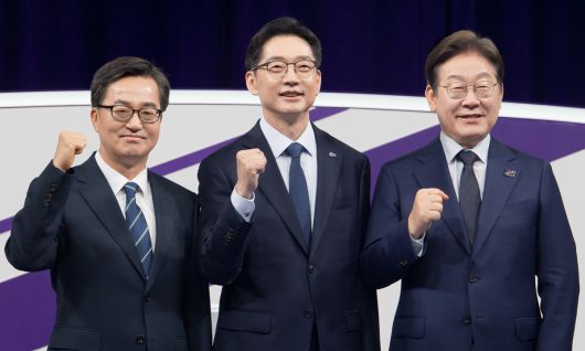 더불어민주당 대선 경선 주자인 이재명(오른쪽부터)·김경수·김동연 후보가 18일 서울 마포구 상암동 MBC에서 첫 TV토론회를 시작하기에 앞서 기념촬영 하고 있다. 국회사진기자단 |
