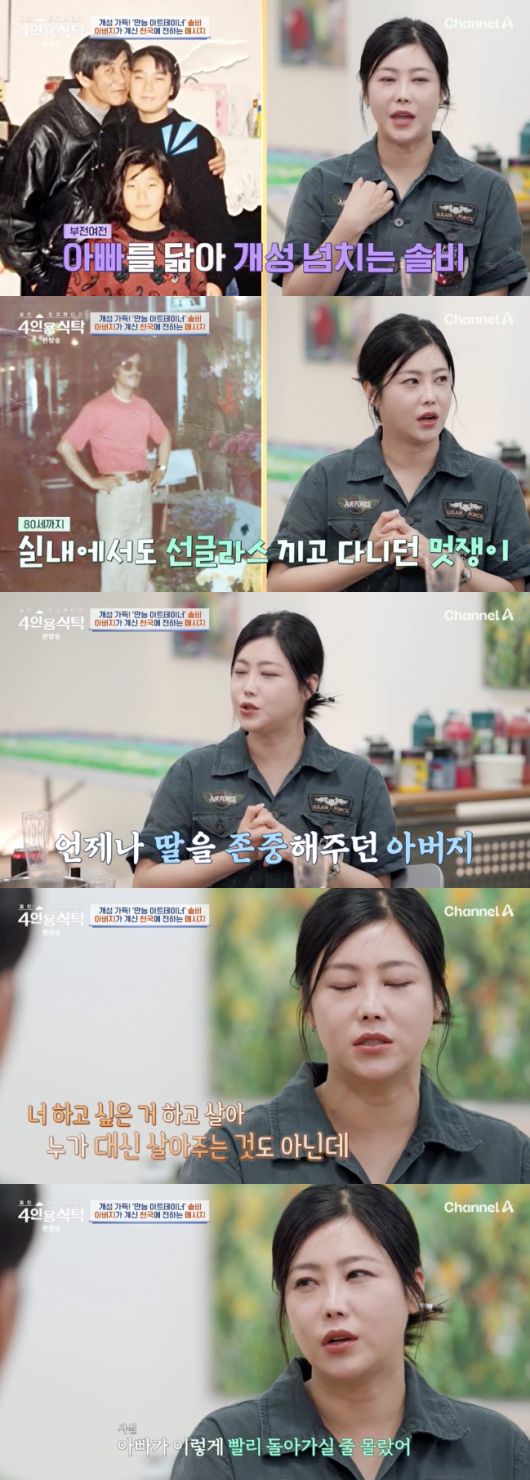 솔비는 “이렇게 빨리 돌아가실 줄 몰랐다. 살아 계실 때 플로리스트였다. 꽃 가게를 하셨다. 살아계시면 아빠한테 그림을 보여주고 싶다. 못 보고 돌아가셨다. 워낙 막내딸을 예뻐해 주셨다. ‘우리 딸 멋있다’ 하실 것 같다. 아빠만의 천국에서 그림을 보고 계시지 않을까”라며 아버지를 향한 그리움을 드러냈다.