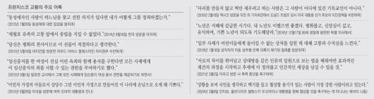 21일 선종한 프란치스코 교황(본명 호르헤 마리오 베르고글리오)은 2013년 3월 보수파와 개혁파 추기경들의 지지를 두루 얻어 제266대 로마 가톨릭 교황으로 선출됐다. 미주 지역 출신의 첫 교황이자 첫 예수회 출신 교황, 서기 8세기 이후 1300년 만에 비유럽 지역에서 배출된 교황이었다. 허례허식 없이 검소했고 낮은 곳에서 빈민들, 소외된 사람들을 위해 살아 청빈한 사제, 행동하는 성직자로 불렸다.