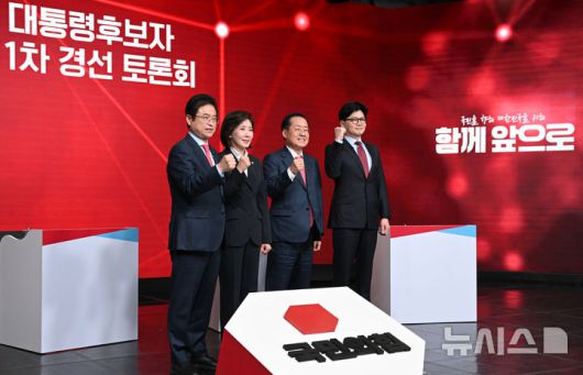 [서울=뉴시스] 국회사진기자단 = 이철우(왼쪽부터), 나경원, 홍준표, 한동훈 제21대 대통령 선거 국민의힘 경선 후보가 20일 서울 강서구 ASSA아트홀에서 열린 '제21대 대통령 선거 국민의힘 1차 경선 B조 토론회'에서 토론 시작 전 기념촬영을 하고 있다. 2025.04.20. photo@newsis.com |