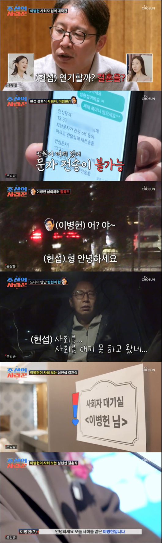 결국 결혼식 2주전까지 사회자를 못 구한 심현섭. 심현섭은 특급 정보를 얻었다며 이병헌이 촬영한다는 곳에서 잠복에 들어갔다. 한참을 기다린 끝에 이병헌을 만난 심현섭. 심현섭은 "4월 20일에 결혼하는데 알려 드리려고 왔다"고 말했고 이병헌은 "진짜 오랜만이다. 어디서 하냐"고 관심을 보였다. 사회자 섭외는 못했지만 이병헌에게 결혼식 날짜와 시간을 알려준 심현섭. 심현섭은 그것만으로 쾌재를 불렀다. 하지만 정작 중요한 사회 얘기를 못한 심현섭. 심현섭은 "진짜 중요한 걸 놓쳤구나"라며 시무룩해졌다.