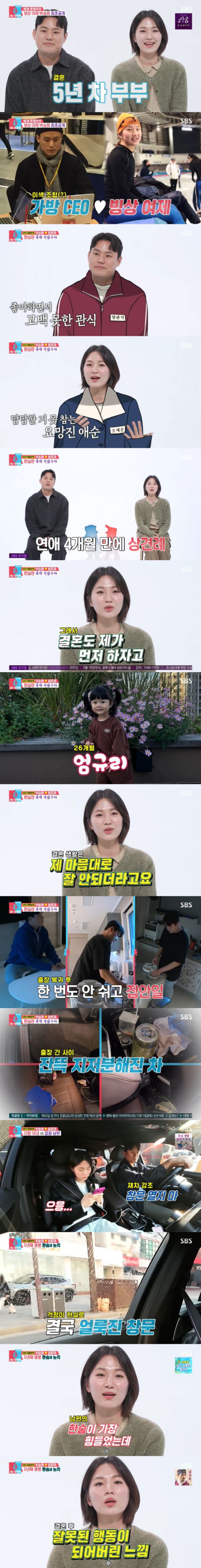 이날 '결혼 5년 차' 박승희는 넷플릭스 드라마 '폭싹 속았수다' 무쇠남 양관식을 능가하는 남편을 공개했다. 박승희 남편은 자수성가한 유명 가방 브랜드 CEO로, 두 사람은 지인 모임에서 만나 친해지게 됐다고.