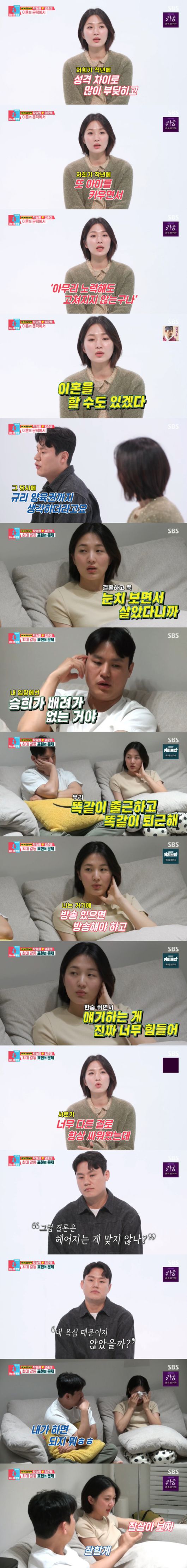 아내의 생활 습관이 힘든 남편과 남편의 표현 방식이 힘든 아내. 박승희는 "서로 너무 다른 걸로 항상 싸워왔는데, 자꾸만 부딪치는 갈등이 힘들다"며 "남편을 생각하면 너무 사랑하지만 자꾸 이런 일이 생기는 게 힘들다. 해결하고 싶은데 해결할 방법을 모르겠고, '이거 해결이 안 되면 못 살겠는데 그럼 결혼을 헤어지는 게 맞지 않나' 싶었다"면서 그동안 남편의 표현 방식으로 인해 서운했던 일들을 떠올리며 눈물을 흘렸다.