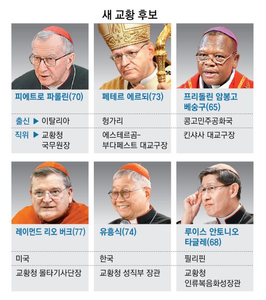 아시아 출신 추기경들도 잠재 후보다. 지난해 12월 영국 주간지 이코노미스트는 한국의 유흥식 추기경(74)을 후보군으로 보도했다. 하지만 한국의 가톨릭 교구가 상대적으로 작은 편이어서 선출 가능성도 다소 떨어진다는 관측이 많다. 가톨릭 신자가 8000만 명에 달하는 필리핀의 루이스 안토니오 타글레 추기경(68)도 유력 후보로 꼽힌다. 개혁 성향인 그는 2013년 콘클라베 때도 교황 후보에 이름을 올렸다.