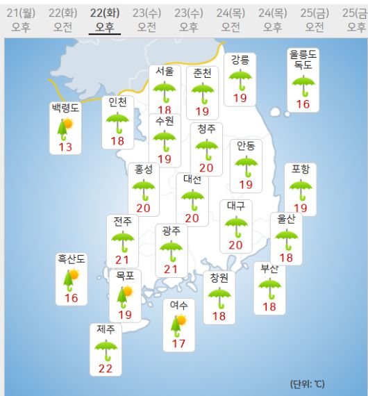 22일 아침 최저기온은 서울 17도, 인천 14도, 수원 16도 등 14~17도, 낮 최고기온은 서울 18도, 인천 18도, 수원 19도 등 18~20도가 되겠다.