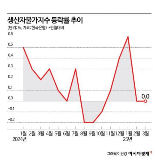 22일 한국은행이 발표한 '2025년 3월 생산자물가지수(잠정)'에 따르면 지난달 생산자물가지수는 전월 대비 보합(0.0%)을 나타냈다. 전월에 이은 보합 기록이다. 지난해 10월 0.1% 내린 후 11월(0.1%), 12월(0.4%)에 이어 올해 1월(0.6%)까지 오름세를 이어온 생산자물가지수는 2월과 3월 각각 0.0%에 머물렀다.